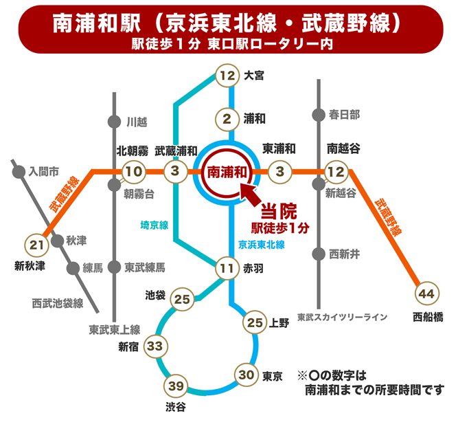 - JR 京浜東北線・JR 武蔵野線 南浦和駅下車徒歩1分 (東口ロータリー内)