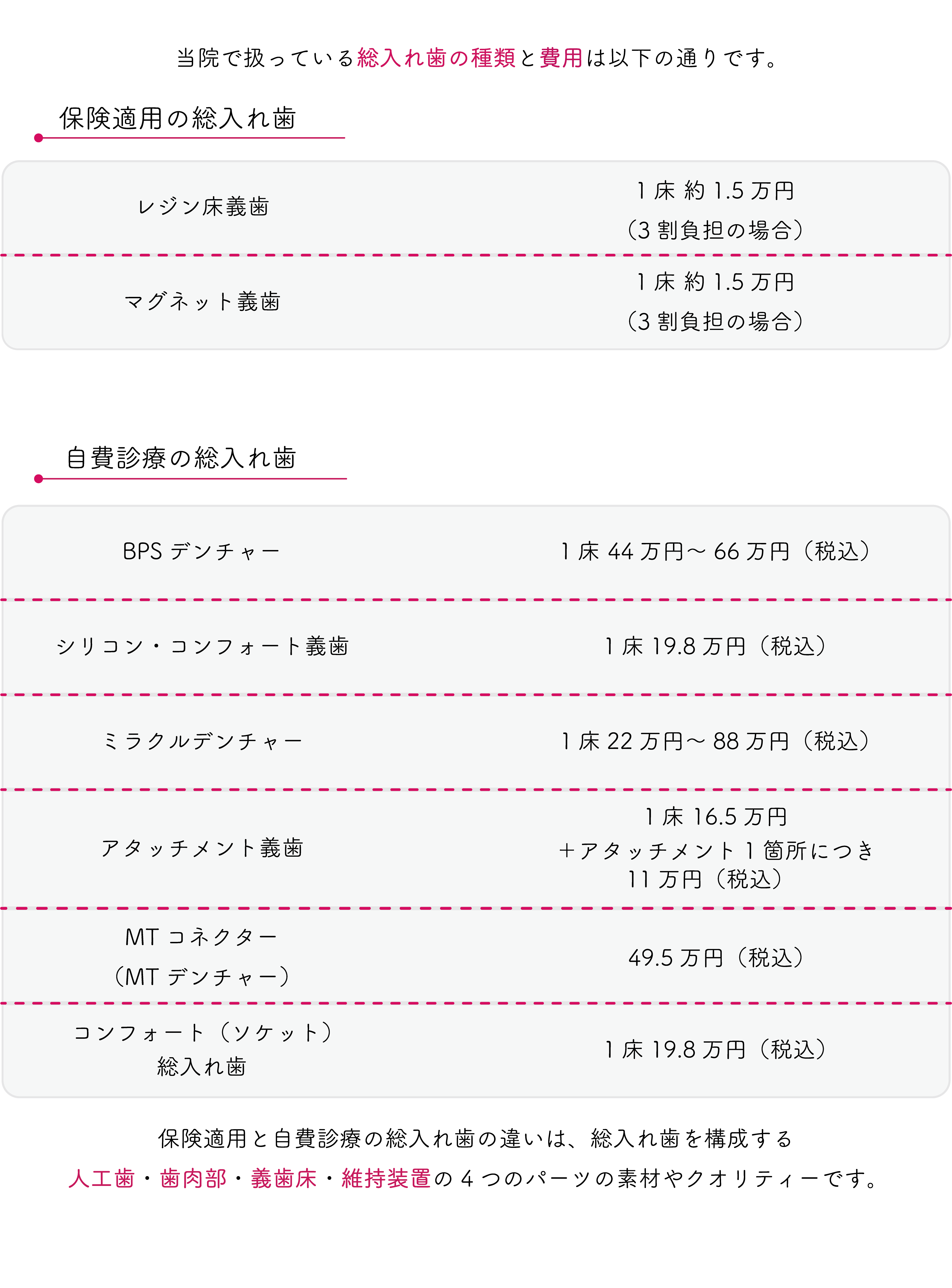 | 自費診療の総入れ歯 | ●人工歯:歯の部分 歯の色や形の種類が多いので、患者様が見た目を満足いくものを選べます。 ●歯肉部:歯茎の部分 種類が豊富なので、本物の歯茎に近い色合いに仕上がり、また、形も好みの形に作れます。 ●義歯床:アゴを覆う部分 種類が豊富なので、機能性や見た目を考慮してお好きなものをお選びいただけます。 いずれも薄くてコンパクトな義歯床にできるので、心地よい装着感です。 ・プラスチック→保険適用のものとは違い、薄くて耐久性のある素材が使われます。 ・金属→熱を伝えやすいので、食事の温度が分かりやすいです。入れ歯の耐久性もアップします。 |