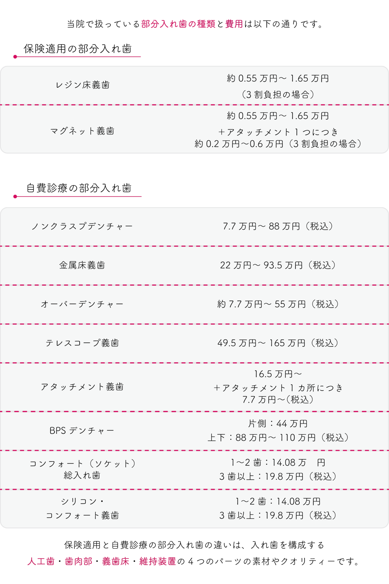 | 保険診療の部分入れ歯 | ●人工歯:歯の部分 選べる歯の色や形の種類が限られます。 人によっては、残っている歯や歯茎との調和がとれない場合があります。 ●歯肉部:歯茎の部分 種類が少ないので、自分の歯茎との境目が目立つことがあります。 ●義歯床:顎を覆う部分 レジンというプラスチックでできています。 割れないように厚く作る必要があるので、異物感があります。 ●維持装置:入れ歯を歯に固定するための装置 「クラスプ」や「レスト」と呼ばれる銀色の針金が付くので、目立ちます。 歯の根が残っている場合は、磁石を維持装置として使えることがあります。 ●入れ歯の製作方法に制限がある 保険適用の部分入れ歯は使用する素材や維持装置、治療工程が細かく決められていて、2段階で作ることはできません。 そのため、事前にフィット感や使い心地などを試すことはできません。 |